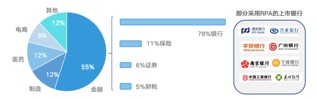 RPA尚处于发展早期,整体渗透率不高。RPA主要应用领域为金融、制造、医药和电商等。目前,国内采用RPA企业金融业占比最高,为55%;其中,金融领域RPA普及率前三的分别是银行、证券、保险,主要是该领域数字化技术应用较早,对新技术应用较为敏感,且存在大量重复、有规则的工作。在合规要求日趋严苛、大量老旧系统改造维护困难的情况下,RPA出现为其提供了新思路。其次,制造业是RPA应用普及率第二大领域,应用场景包括订单管理、物流数据跟踪、工厂记录管理和报告、库存和供应商管理等大量标准化的重复性工作;电商行业因目标客户群大、信息化程度高,在其上架、营销、客服、物流等各个环节,都拥有大量的RPA场景。